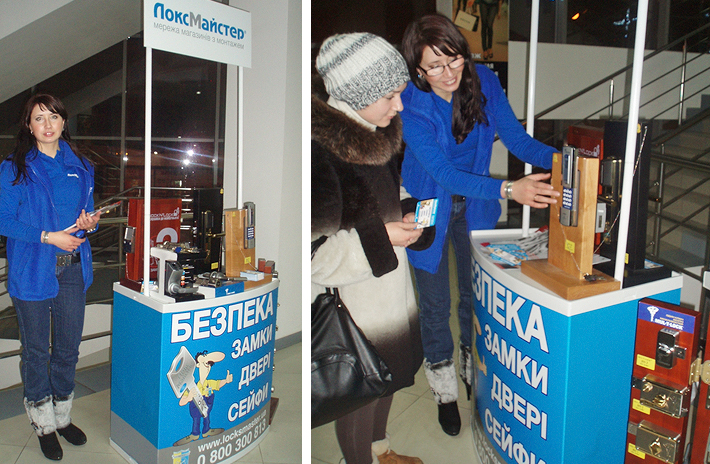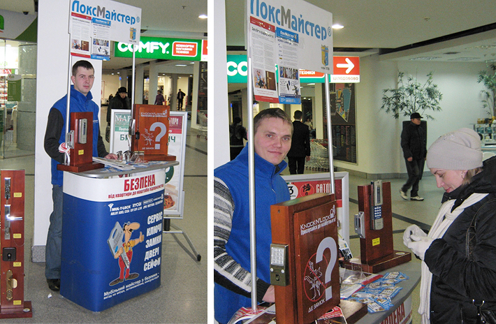 У донецькому торговому центрі «Континент» та у дніпропетровському «МОСТ – Сити центр» локсмайстри презентували продукцію безпеки. Традиційні запитання до експертів з безпеки щодо підбору надійних засобів замикання житлових та нежитлових приміщень задавали і цього разу. Відвідувачі жваво цікавилися особливостями високосекретних замкових циліндрів, вхідними дверми безпеки та перевагами захисної фурнітури. У Дніпропетровську до локсмайстрів звернувся клієнт – власник фітнес-клубу, який захотів обладнати продукцією безпеки точку проходу закладу. Досить цікава тенденція намітилась серед жителів східного регіону: чимало запитань відвідувачів стосувалось електромеханічних систем замикання. Це свідчить про зростання довіри до таких засобів замикання та про бажання наших громадян використовувати високотехнологічні рішення, в тому числі і у безпеці, у повсякденному житті.